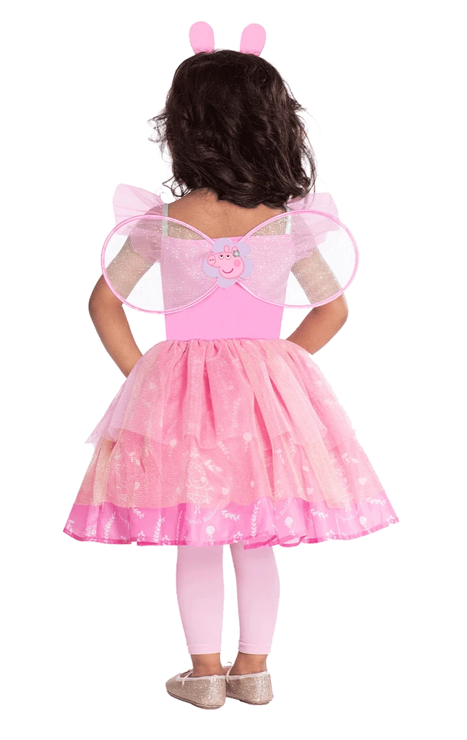 This Kids Peppa Pig Fairy Costume features a Peppa Pig emblem on the chest, and comes complete with a pink pig floral headband and attached fairy wings.