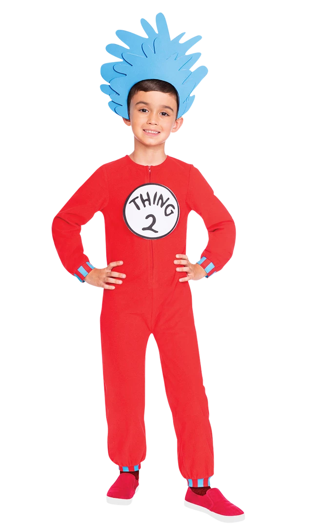 This World Book Day take a step into the brain of the mad and clever Dr Seuss! The ultimate costume for siblings, twins or best friends, this officially licensed Kids Thing 1 & 2 Costume will have your little one looking like they’ve jumped straight out of The Cat in the Hat book! Featuring one bright red jumpsuit and blue foam headpiece an and interchangeable “Thing 1” and “Thing 2” chest badge. Let your child or children rock up to school as their favourite imaginary mischief making characters, and share the celebration of Dr Seuss.
