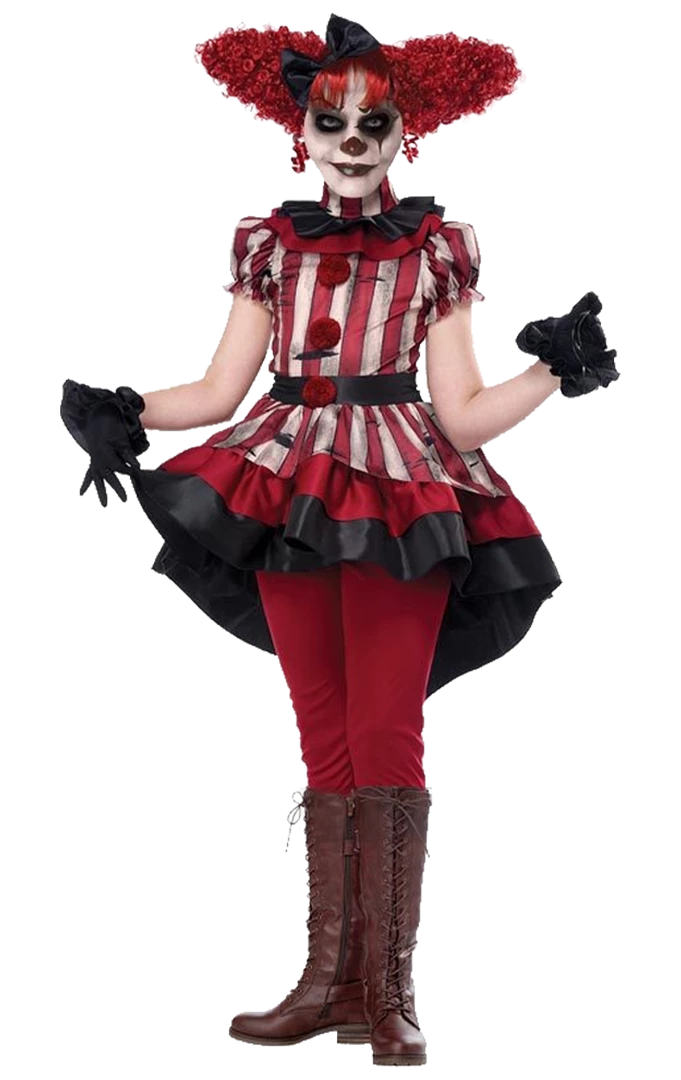 This Halloween, your little one will have the coolest kids clown costume on the street when trick-or-treating in the Kids Wicked Klown Costume. The striped top and skirt combination feature three red pom-poms, puff-ball sleeves, a black and red neck ruffled collar and a multi-layered skirt. Completing this unique look is a pair of red slim-fit trousers, a sinister clown facepiece, gloves and cuffs. It’s spooky, scary and fit for a circus princess!