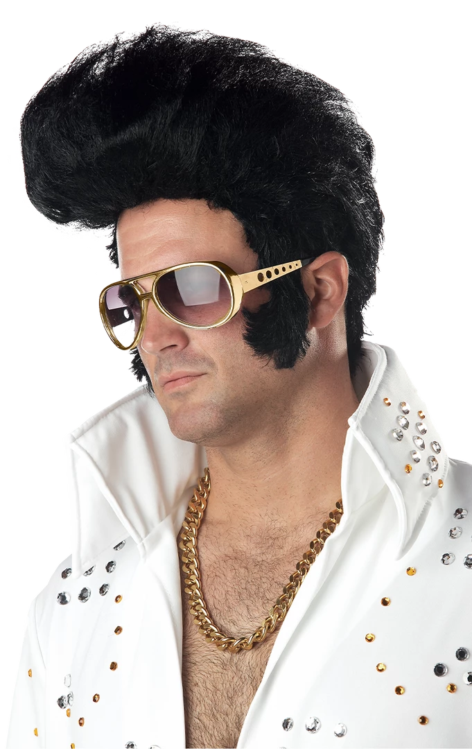 Elvis wig with sideburns and high quiff. Glasses and other accessories are available separately.