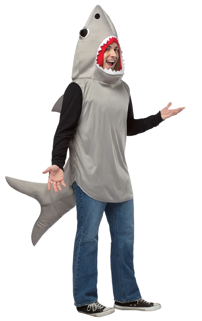 The Adult Shark Costume is lightweight and can easily be worn over your clothes. Headpiece, fin and tail are attached. Please note: T-shirt and trousers are not included.