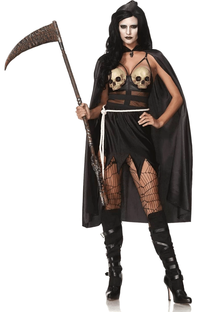 Add some sex appeal to the classic grim reaper costume this Halloween by sporting the Sexy Death Dealer Costume to your Halloween party! This dress oozes sultry style and boasts an unusual design feature of a skull bra top with a sheer netted bodice and a jagged hem skirt. A cape also comes with this sexy costume, and it’s even better when paired up with some fishnets and scythe! So get the look this Halloween and shop off your figure in this number!