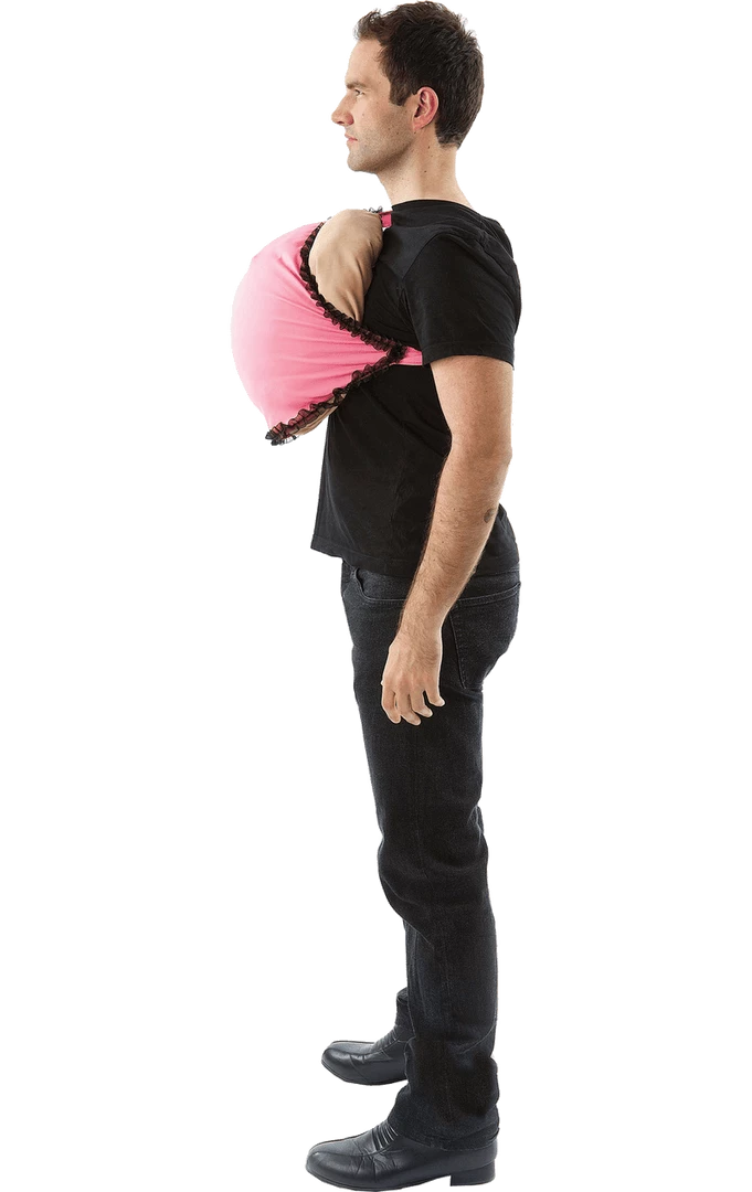 Our Adult Boob Bra Couples Costume comes complete with half a pink bra with a black lace effect. The outfit fits on over the head and sits comfortably all evening long. You’ll look perfect when twinning with your mate.