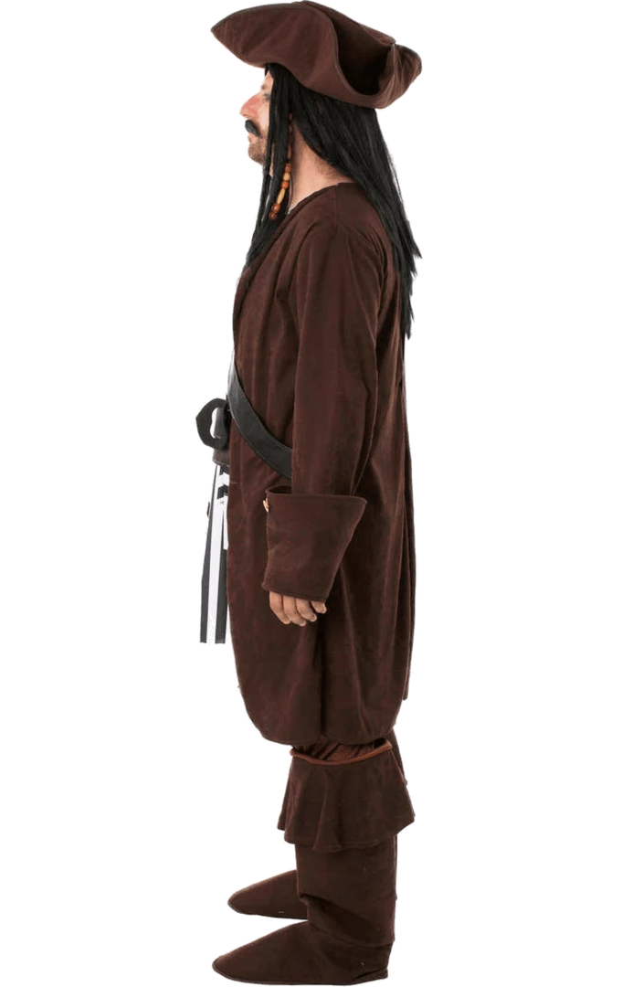 The Men’s Caribbean Pirate Costume is made up of a long brown jacket with large cuffs and gold buttons. It also features an attached white top, a thick black belt and striped rags hanging from the front. A pair of matching trousers are included too. To complete your adventurous pirate look is a classic brown hat, so you can look just like the captain of the Black Pearl.
