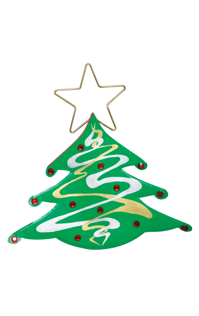 The Christmas Tree Handbag is a gorgeous green bag in the shape of a tree. It features shimmering gold and silver detailing, as well as gold shimmering studs for baubles and a star for the handle.