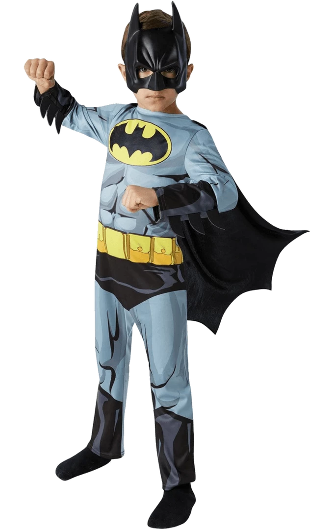 The Kids Original Batman Costume is made up of a long sleeved grey and black jumpsuit. It features intricate details printed on the front, with 6-pack muscles on the torso, a utility belt and the iconic Batman logo on the chest. Completing the look is a black cape that is attached to the shoulders with Velcro, plus a half-face Batman mask that will conceal their true identity.