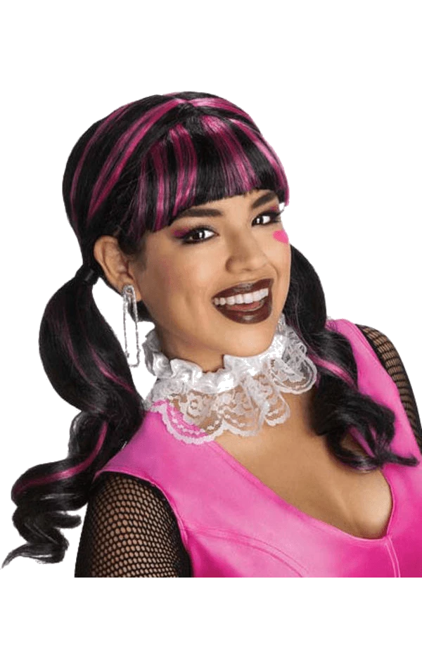 Complete your Draculaura look in our Draculaura Monster High Wig. Comes complete with pretty black and pink pig tails and fringe.