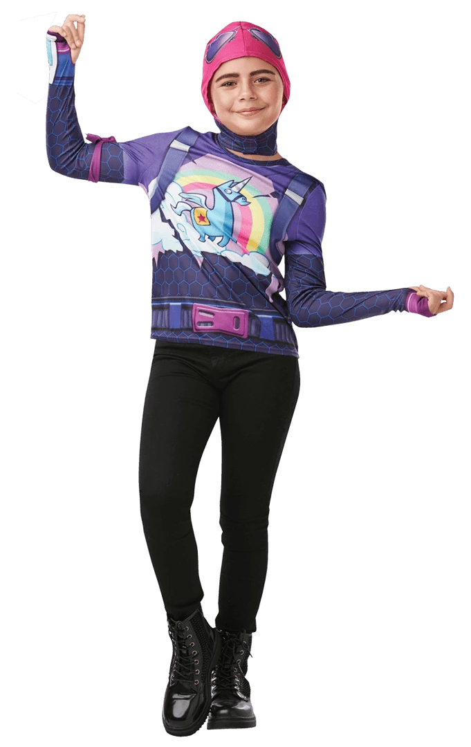 Get cute, sweet, yet totally ruthless with our Kids Brite Bomber Costume Let your little one finally transform into their favourite Fortnite skin with this fully licensed outfit. Watch as their eyes light up when they realise they have their very own costume from the smash-hit game! Ideal for a unique Halloween or even as a Christmas present to those die-hard fans out there. Includes multicolour printed shirt, purple armband and pink snood.