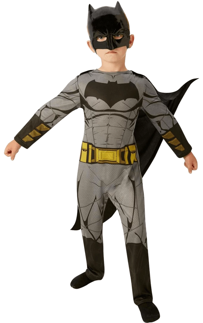 The Kids Dawn of Justice Batman Age 9+ Costume is made up of an all-in-one black and grey jumpsuit that’s printed with intricate detailing, including the gold cuffs, belt, and iconic black bat logo. Completing the look is a black cape and matching black bat mask to conceal their identity. They’ll be ready to take off into the night to defeat their enemies in no time! Â