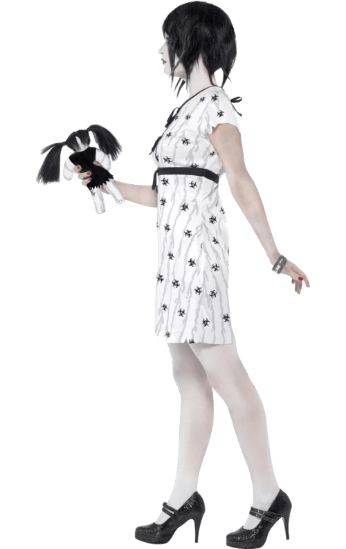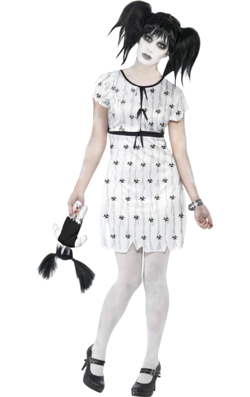 Wanted to be a creepy doll or scary little girl? Now you can be oh so terrifying in the Abby Normal Doll Costume. Perfect for Halloween, you can add any creepy make up to this as you like. Transform into a cracked doll, a ghostly pale girl or even a evil spirit! Pair up with some contact lenses and a murder weapon for the extra creepy look! The dress is decorated with black ribbon bows down the front and a black waistband.