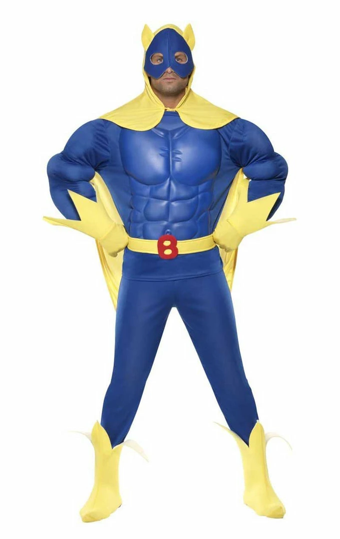 If you’ve missed a workout, then no need to worry, as our all-in-one blue jumpsuit has a realistic 6 pack front for you to show off to the world! Also included is a yellow cape that can be tied at the front, a matching belt with the letter ‘B’, a pair of yellow gloves and matching boot covers that resemble banana peels.