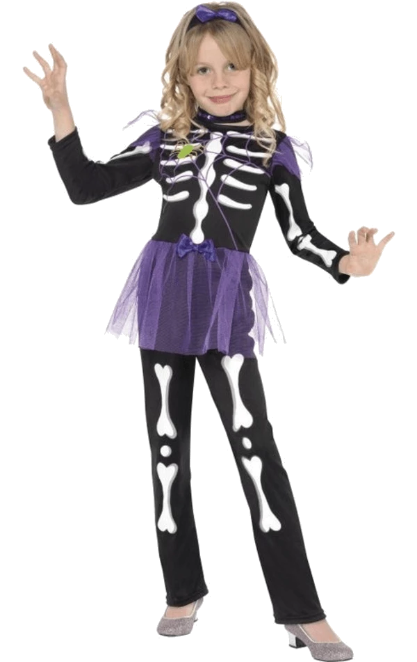 This costume Skellie Punk Girl Costume a black jumpsuit with printed skeleton bones on the front of the outfit. The purple tutu makes the outfit a bit more glamourous for your girl and comes with a cute little bow at the front. A black headband with a purple bow and a black and purple choker finishes off the costume.