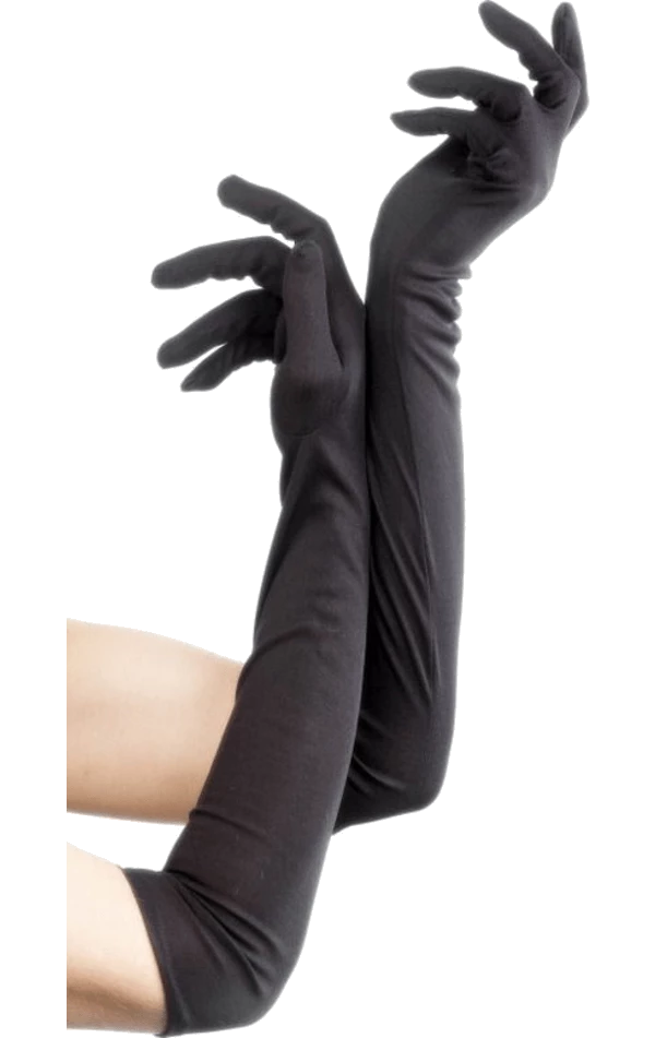 These elegant long black gloves are made from Jersey fabric with a nice sheen. They are a one size item designed to fit most adults. Fabrics are 100% polyester.