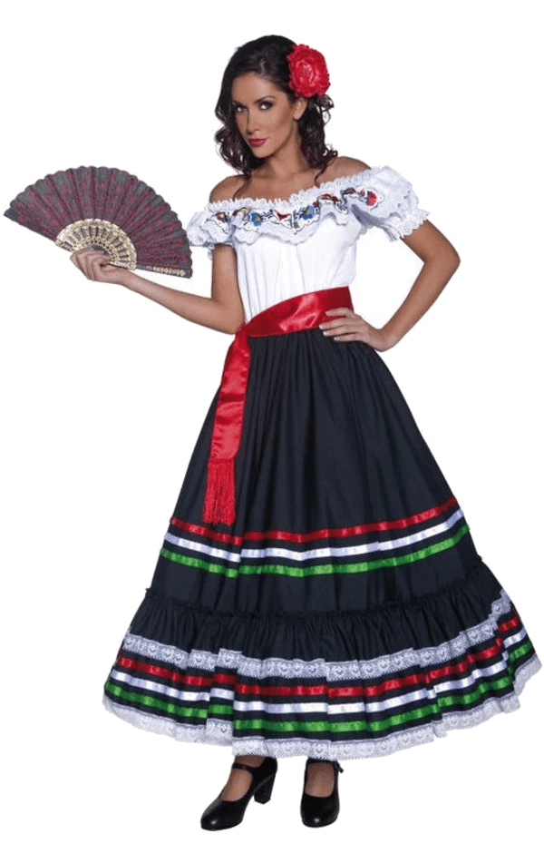 Become a sexy Senorita in this traditional Mexican Woman costume. Great for South American and Latino Around the World style parties or even for transforming into a stunning Halloween Day of the Dead costume, with the help of some skull styled make-up. Don’t forget your maracas or dead rose bouquet, depending on which look you choose!