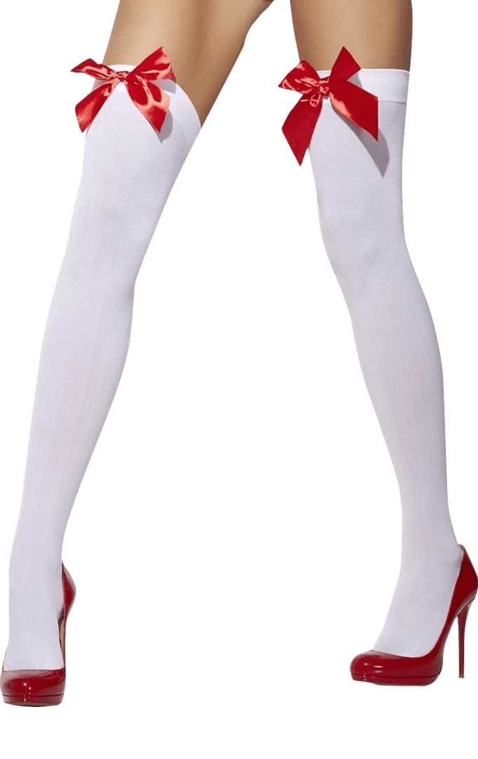 Looks like Little Red Riding Hood or Snow White got a bit of a makeover! Make any cute outfit that little bit more sexy with these cute and playful White with Red Bow Stockings and have the party goers attend to you at your beck and call…Popular costumes they can be combined with include nurse outfits, cosplay characters, Snow White, Where’s Wally/Wenda, Miss Claus and many more. There’s always an occasion to use cute white stockings with red bows.