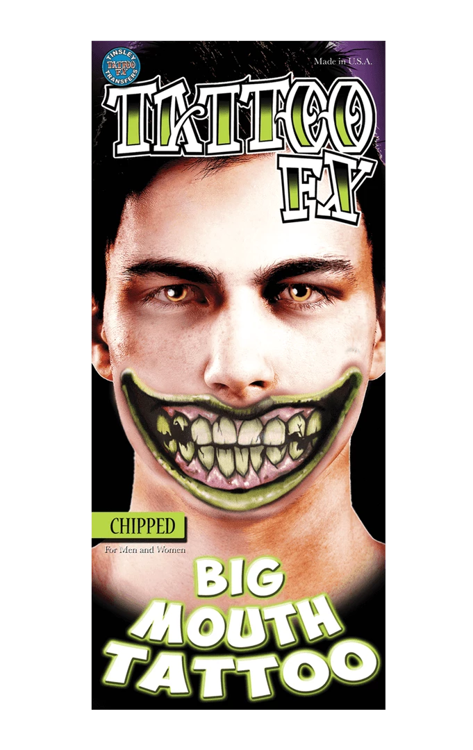 Want to make a BIG statement this Halloween? Want to make a funny and disgusting one too? The Chipped Big Mouth Tattoo is the perfect choice as it comes as a huge intimidating smile sure to chill to the bone, but also fascinate party goers who will gravely suggest some dental work needs to be done pronto!