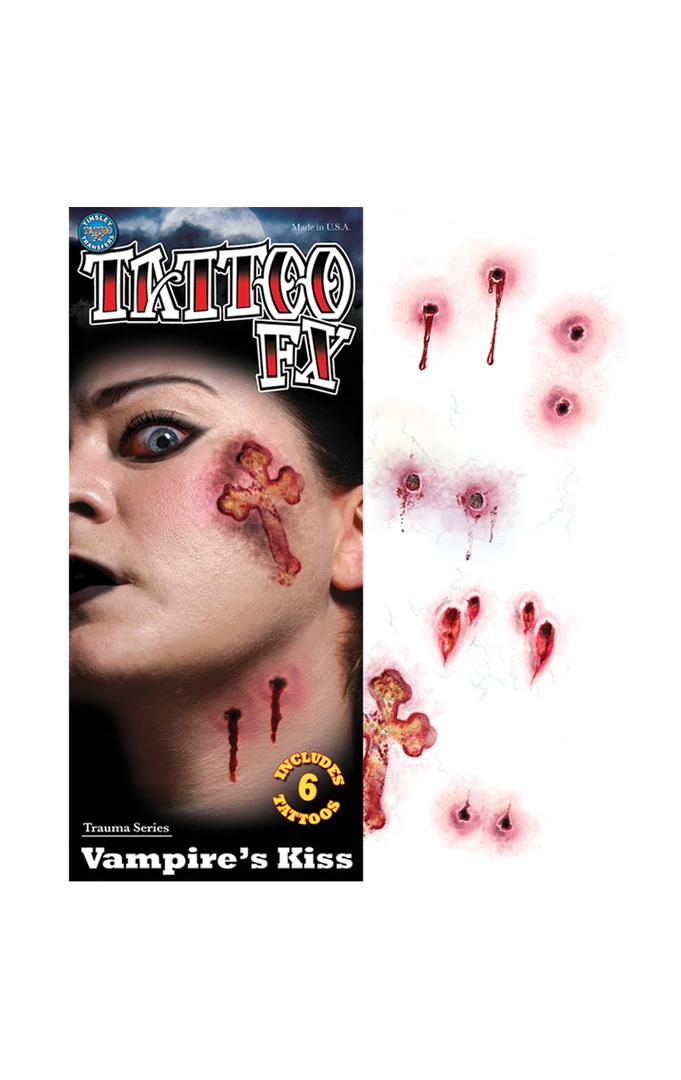 Want to appear as if you have had an altercation with a neck sucking, blood drawing vampire? Want to make an extra individual effort to be vial this Halloween? Get yourself the Vampire Kiss Temporary Tattoos and horrify the party goers with your puncture wounds and burns! Yeochy!